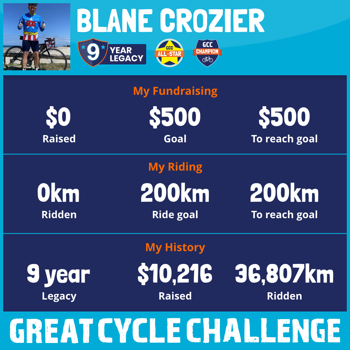 This October, I am again taking part in the Great Cycle Challenge to fight kids' cancer, but this year is slightly different. This year I am riding for a close friend, Wayne RICHTER, who is currently battling blood cancer, requiring a bone marrow transplant. At the time of riding the Great Cycle Challenge we will be hoping for great news that the transplant has been successful.
