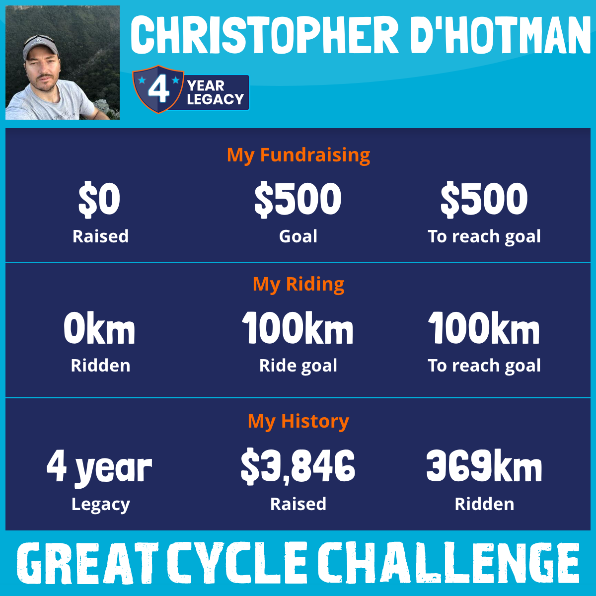 You can donate through my fundraising page here: https://greatcyclechallenge.com.au/Riders/CdH