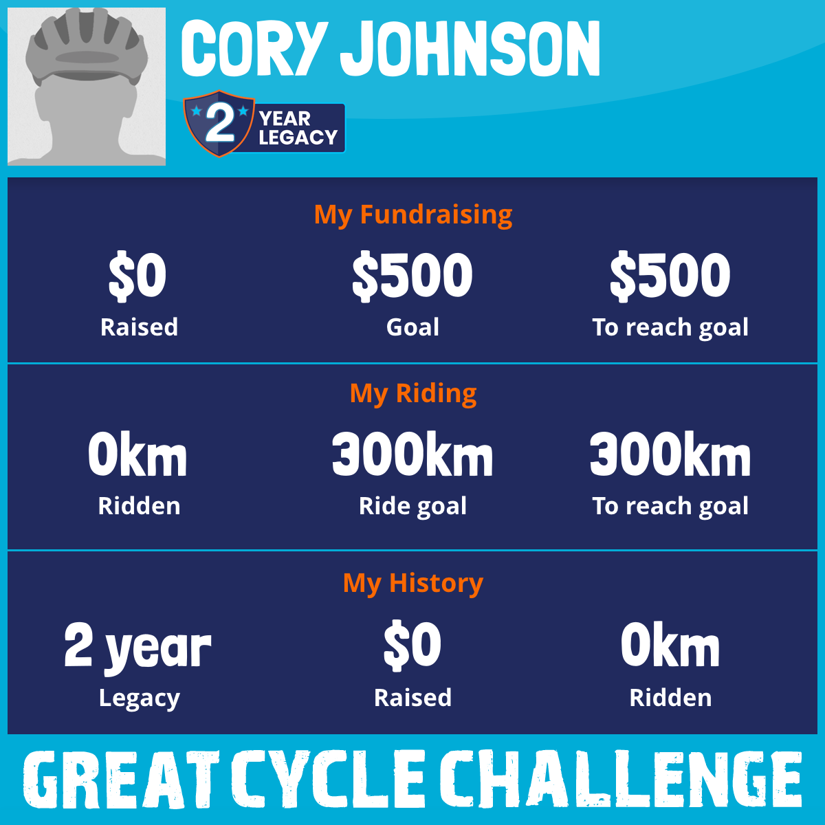 I am riding 300 km for my myself, Cory. Please sponsor me and support my challenge to fight kids' cancer and save little lives.