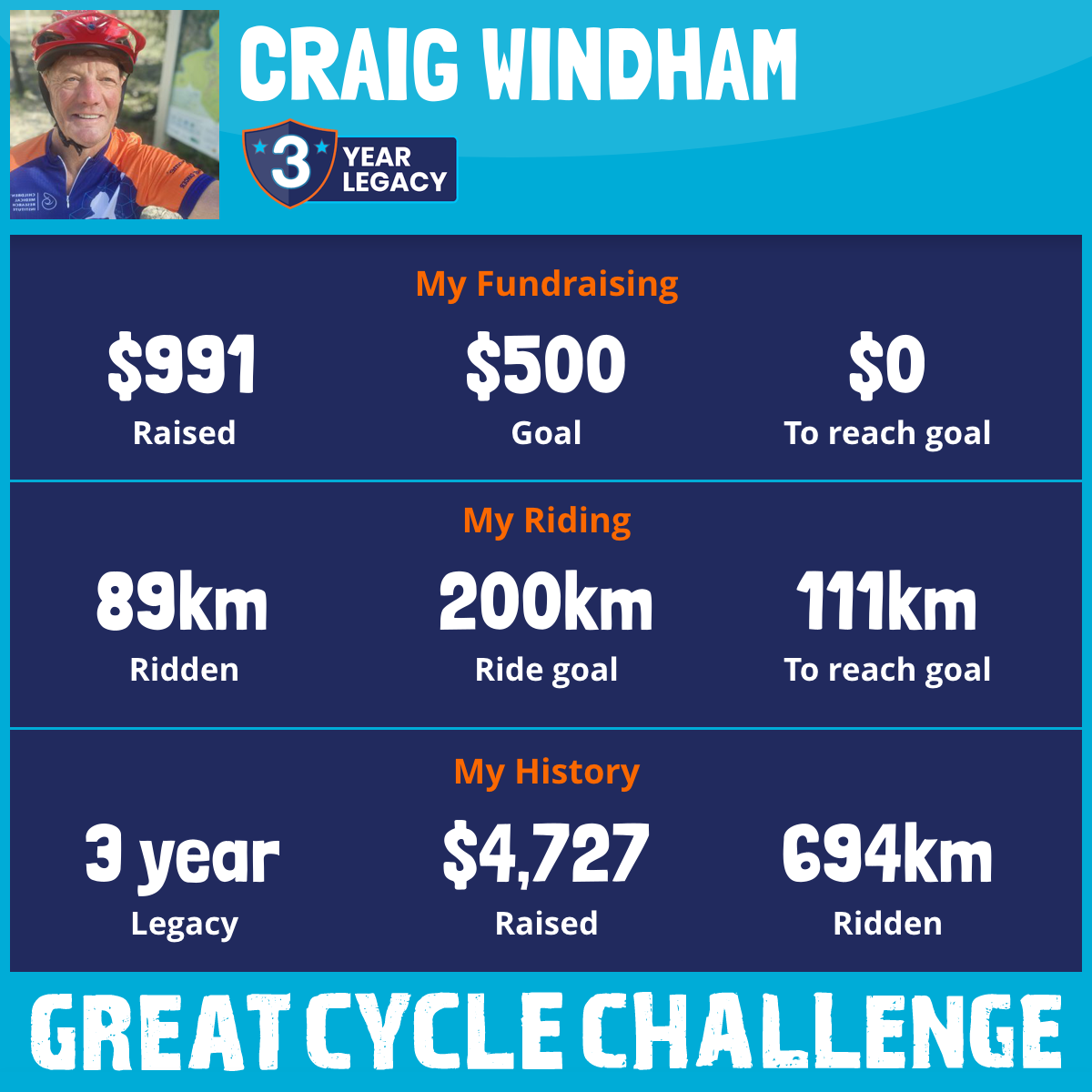 And so I am riding and raising funds to support the Children's Medical Research Institute to continue their work into the prevention, diagnosis, treatment and finding a cure for childhood cancer.