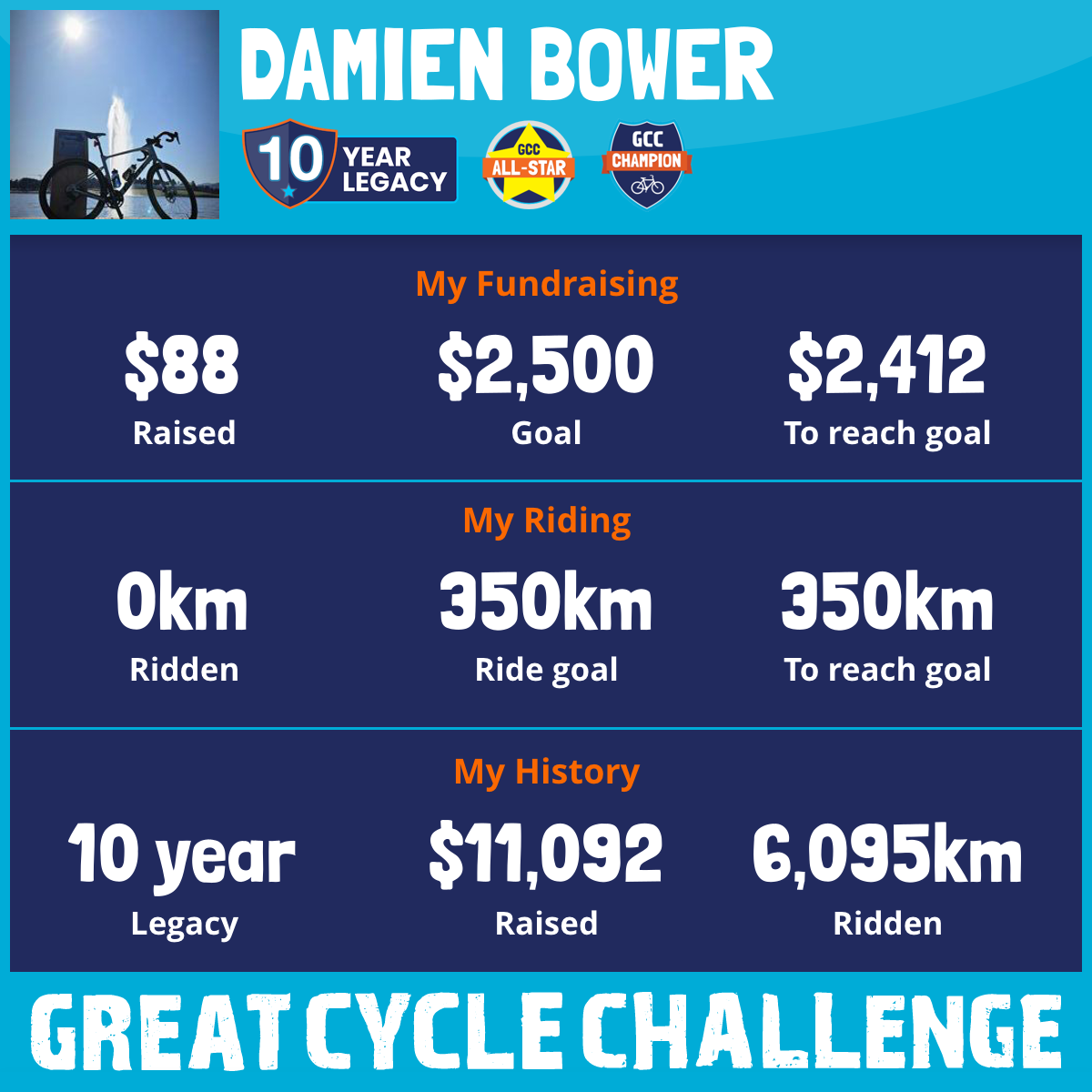 8 Oct 2025Well 8 days in and I am on the bike again to support this amazing cause for my 10th year. 60km down and over $1400 raised in just 8 days. So many great supporters for this cause. Well I will keep at it and we will try to reach both my distance and km goal again.
