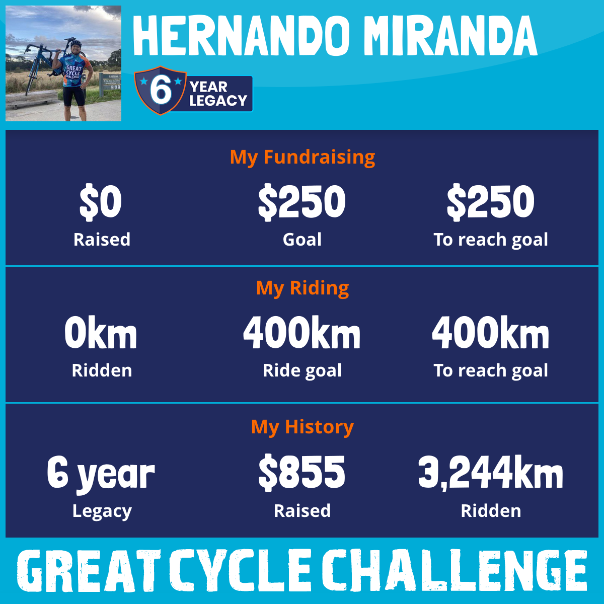 I am riding 400 km in memory of In the memories of my dad Domingo Miranda. Please sponsor me and support my challenge to fight kids' cancer and save little lives.