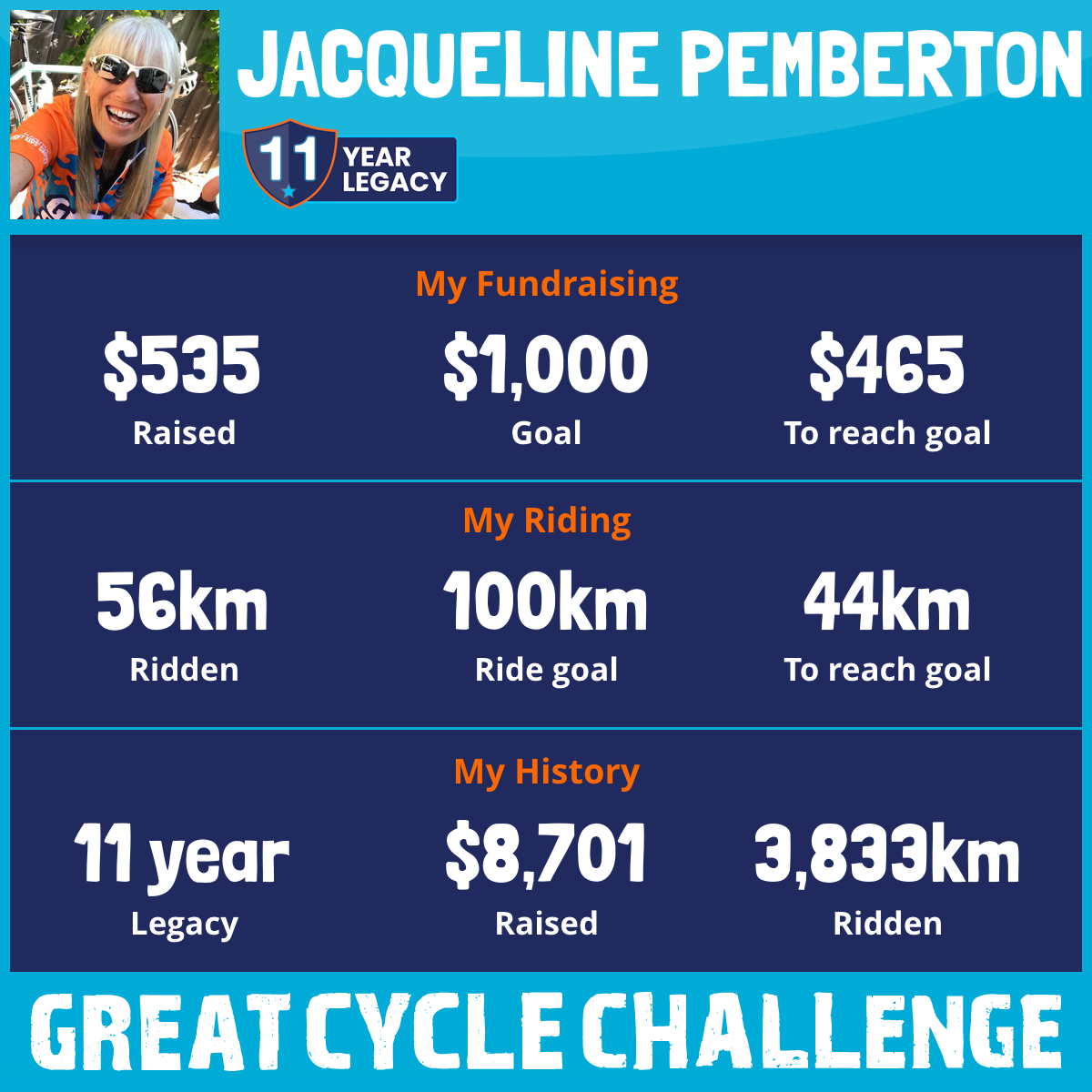 My father was a cyclist through and through for most of his life. He and I spent many kms on the road together. At 80 years young dad was riding right up until a month before cancer took him from me. Together on our trusty mountain bikes we rode 481kms between Esperance and Albany in 4 days! So this year, once again and in his memory I will be riding during October for the eleventh year in a row, to raise funds to reach my initial goal which was to raise ten thousand dollars in ten years , to support childhood cancer. Dad loved kids and would be proud Im doing this.