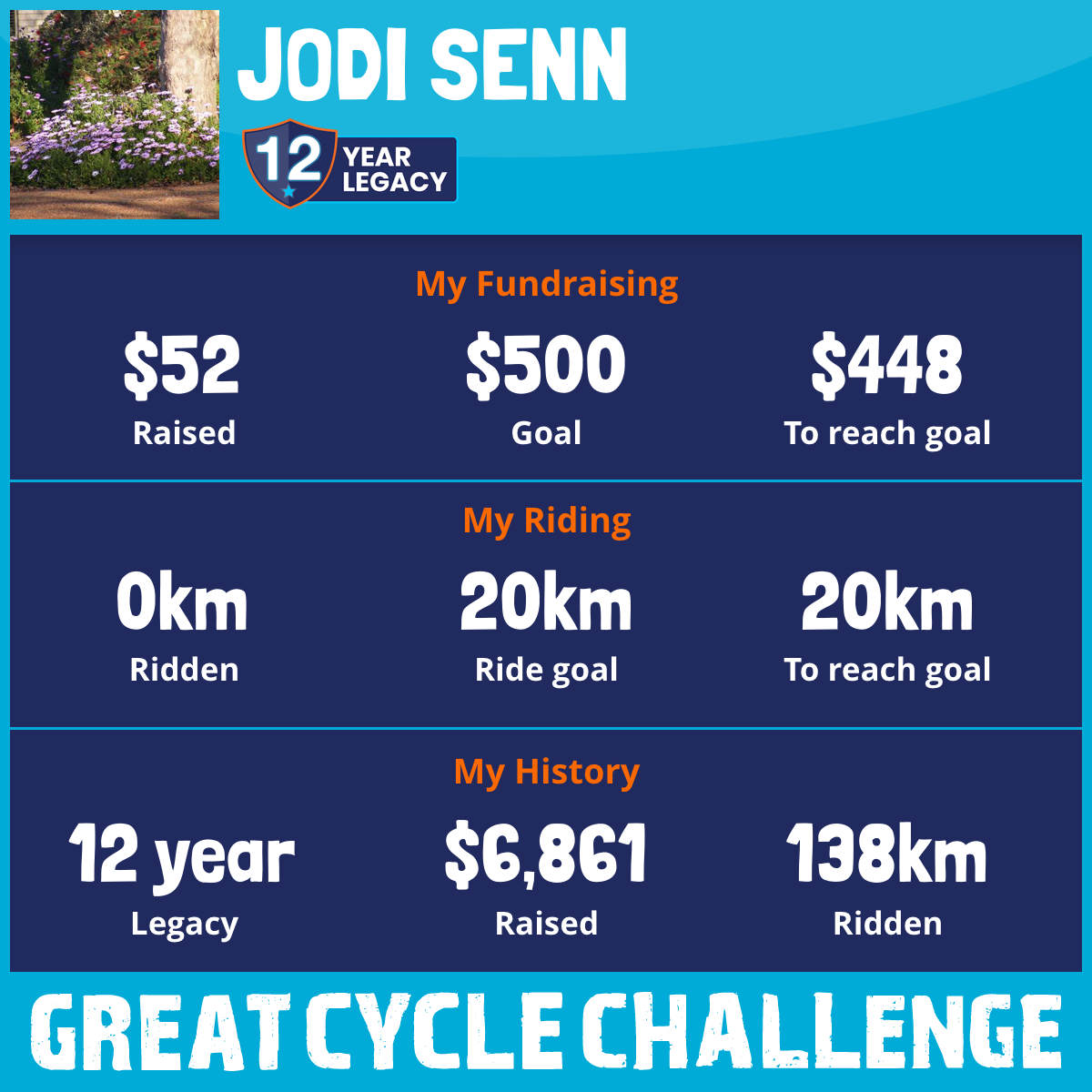 This October, I am taking part in the Great Cycle Challenge to fight kids' cancer! I'm riding with my new knee and my dodgy one so I've set my goal for kilometers a little lower than in previous years. This year I'm riding to show support for those past and present students who have fought this tough battle. In particular one brave young man who sadly lost his fight - whilst he may have been a grown up now he shall forever be a little boy with a huge smile in my heart - This one is for you Elijah xxx I'm also riding this year again in memory of my sister Vicki - always in my heart -- cancer sucks. Also for a new victim Sara Holmes. xx taken too young.
