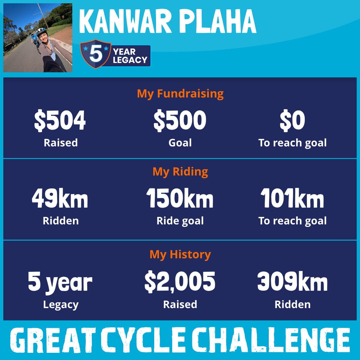 Once again, this October, I am taking part in the Great Cycle Challenge to fight kids' cancer! In the past 5 years, I've roughly ridden the distance from Sydney to Canberra, and hope to continue further.