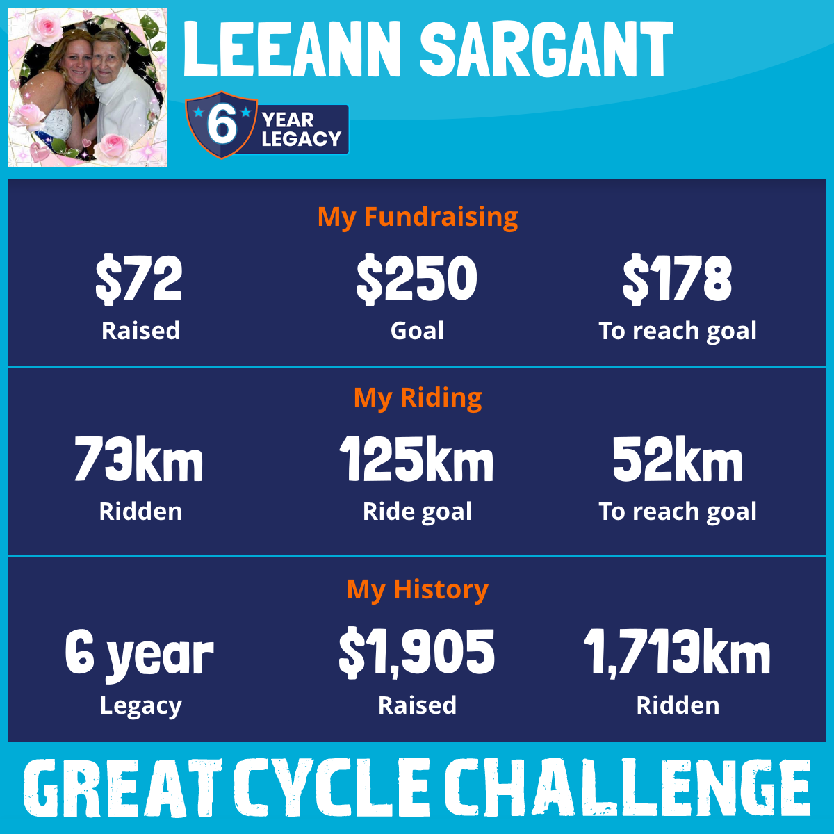 I am riding 125 km in memory of my mum, Jan. Please sponsor me and support my challenge to fight kids' cancer and save little lives.