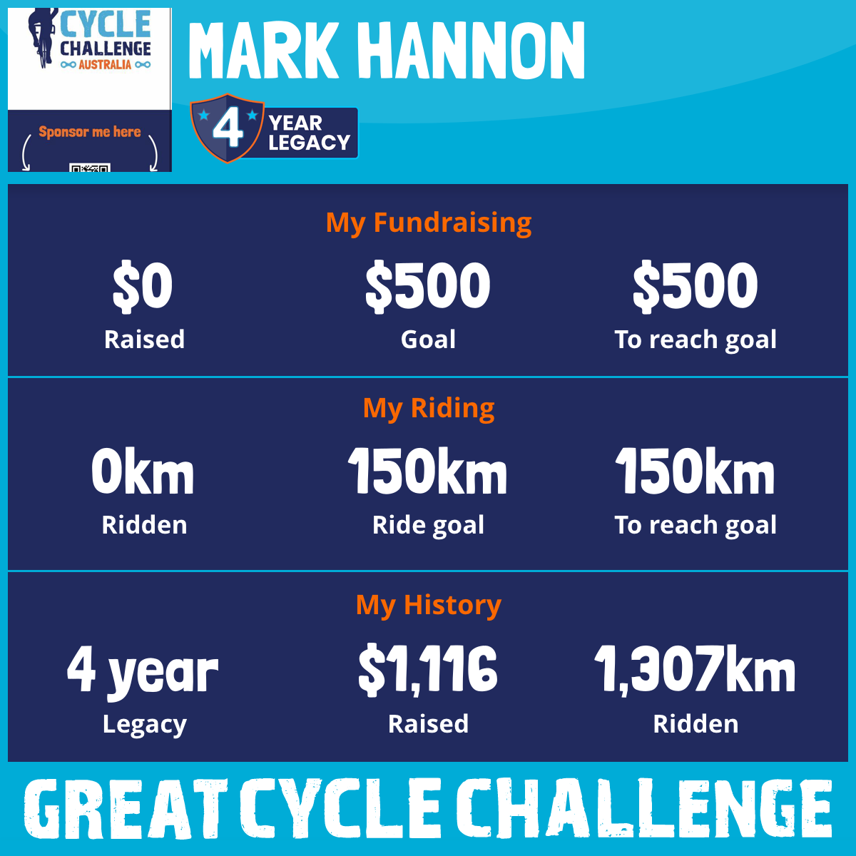 I am riding 150 km in memory of Mark Hannon. Please sponsor me and support my challenge to fight kids' cancer and save little lives.