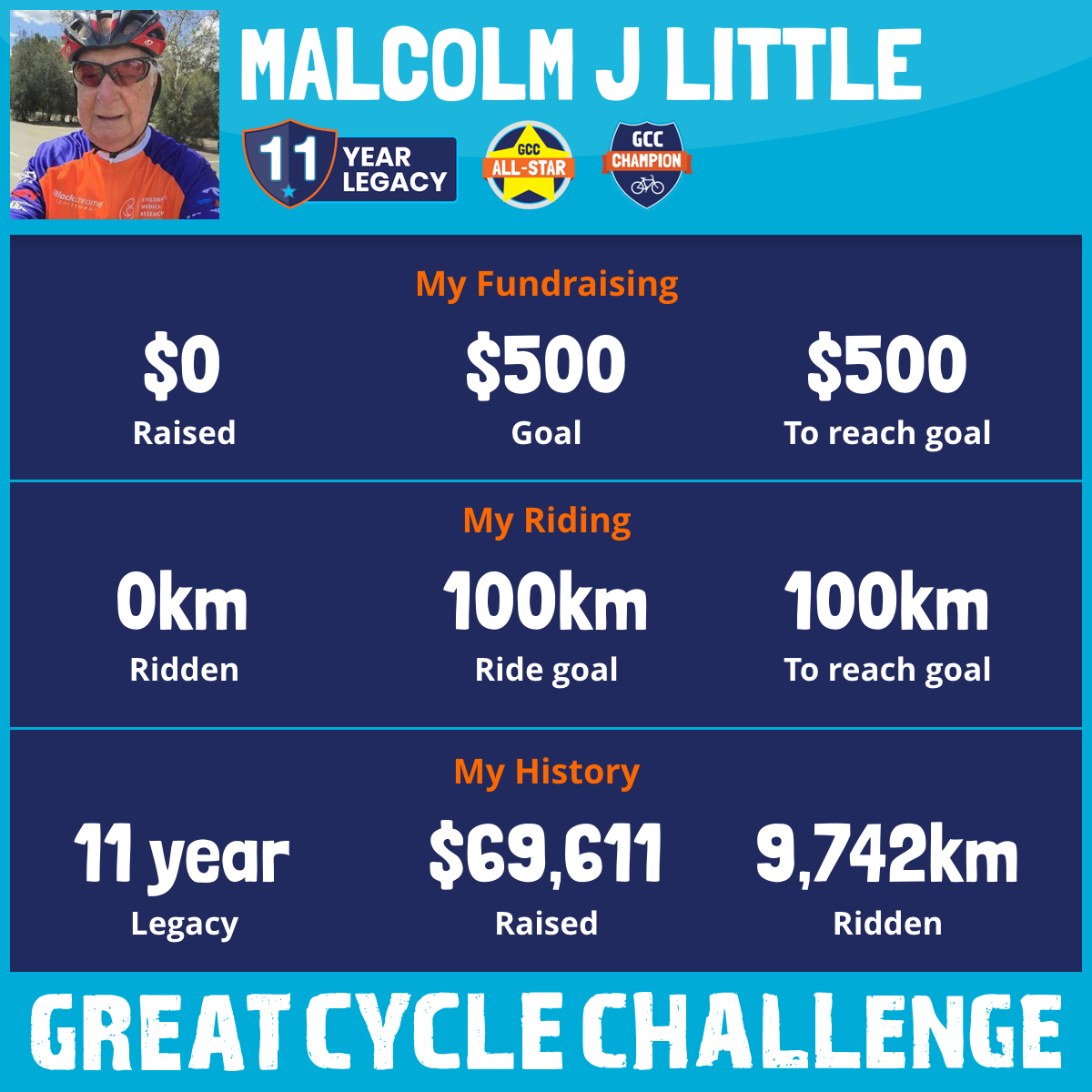 In October, each year I have cycled and raised much needed funds to help Fight Kid’s Cancer. This year will be my tenth and final year, being 84 years of age, Over the previous nine years I have ridden 9,592 kms and raised $52,132 for this very special cause.