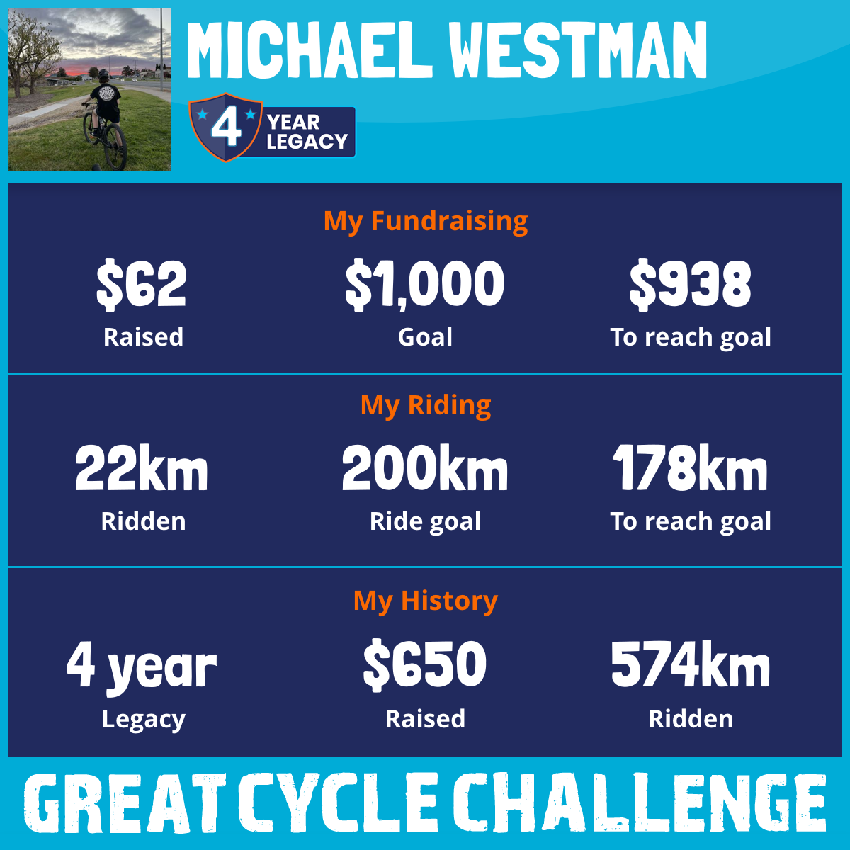 And so I am riding and raising funds to support the Children's Medical Research Institute to continue their work into the prevention, diagnosis, treatment and finding a cure for childhood cancer.