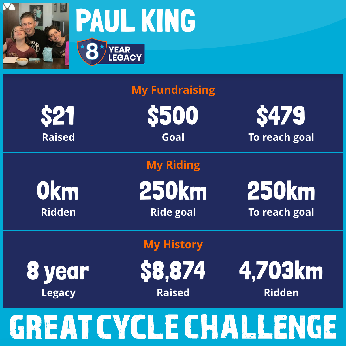 For the 6th year in a row I'm raising funds to fight kids cancer. I'll be riding minimum 200km in October with a goal to raise minimum $500.