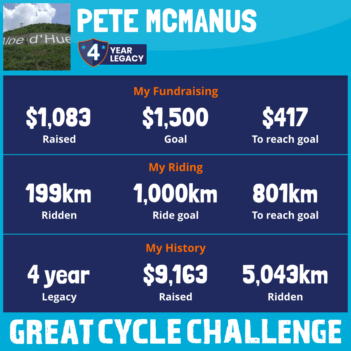 Hi Everyone it’s October again. And this year I am taking part in my 4th Great Cycle Challenge and again like each of the previous three. I’m riding to fight kids' cancer!