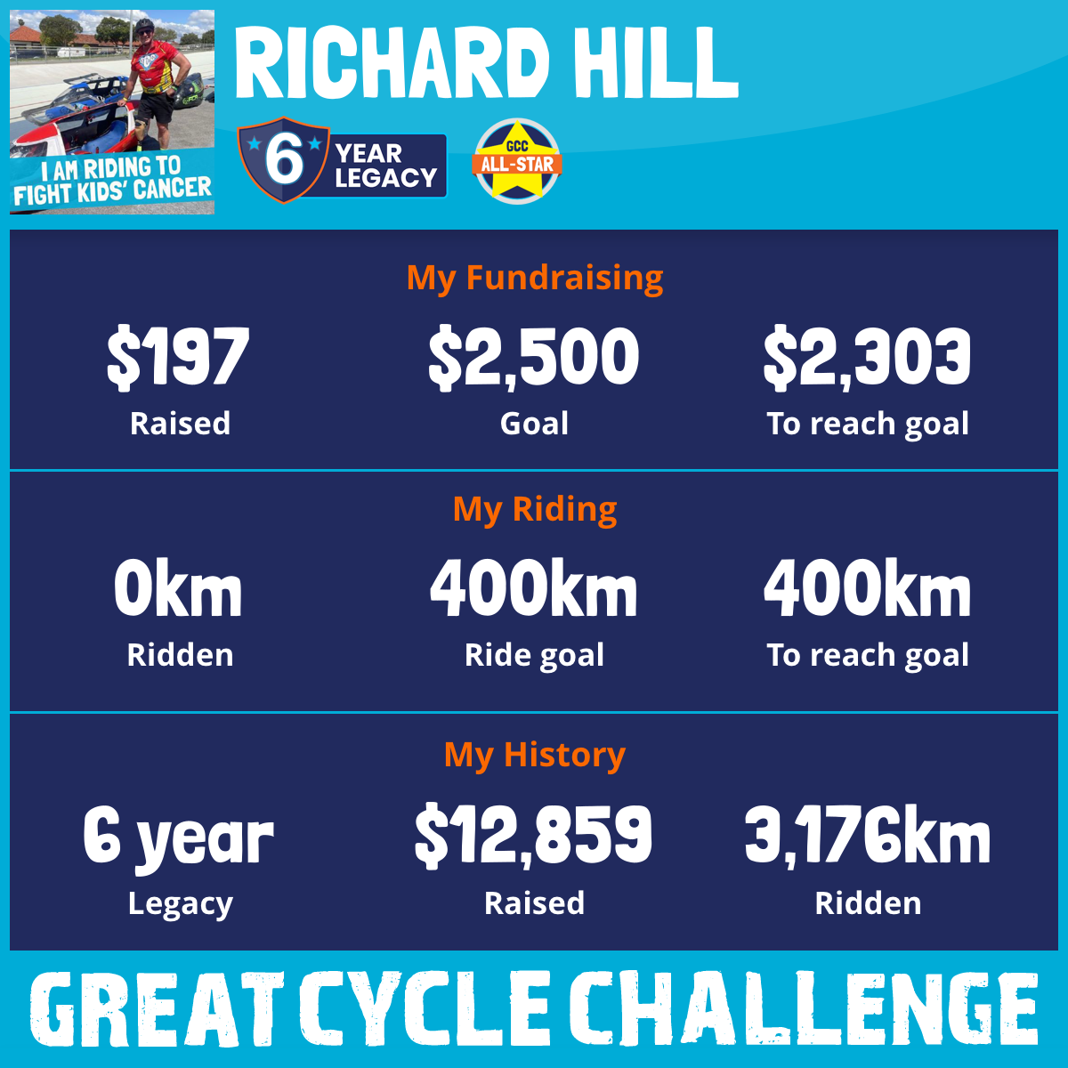This is my SIXTH year doing the Great Cycle Challenge. Last year, with generous donations, WE raised over $3400 to go directly to the Children's Medical Research Institute cancer research team. Add to that the totals from previous years, a grand total of $12,700! FANTASTIC!