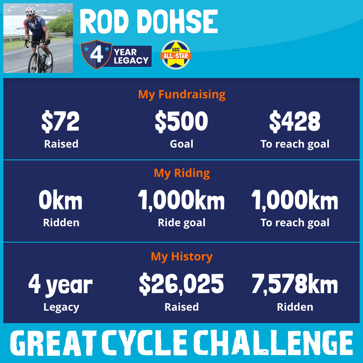 This will be my fourth year riding the Great Cycle Challenge raising funds for research, care and support for our youngest Australians battling cancer.