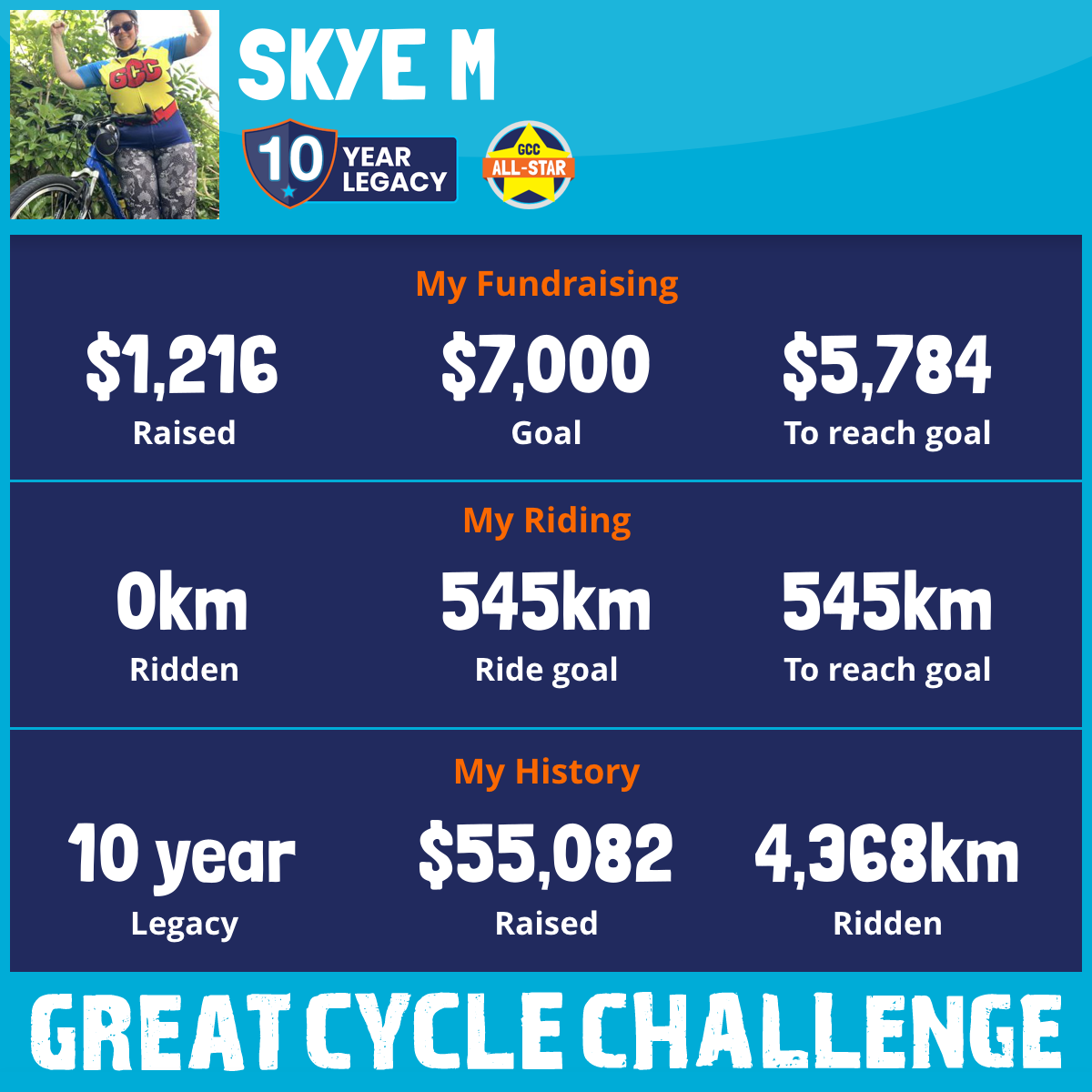 And so I am riding and raising funds to support the Children's Medical Research Institute to continue their work into the prevention, diagnosis, treatment and finding a cure for childhood cancer.