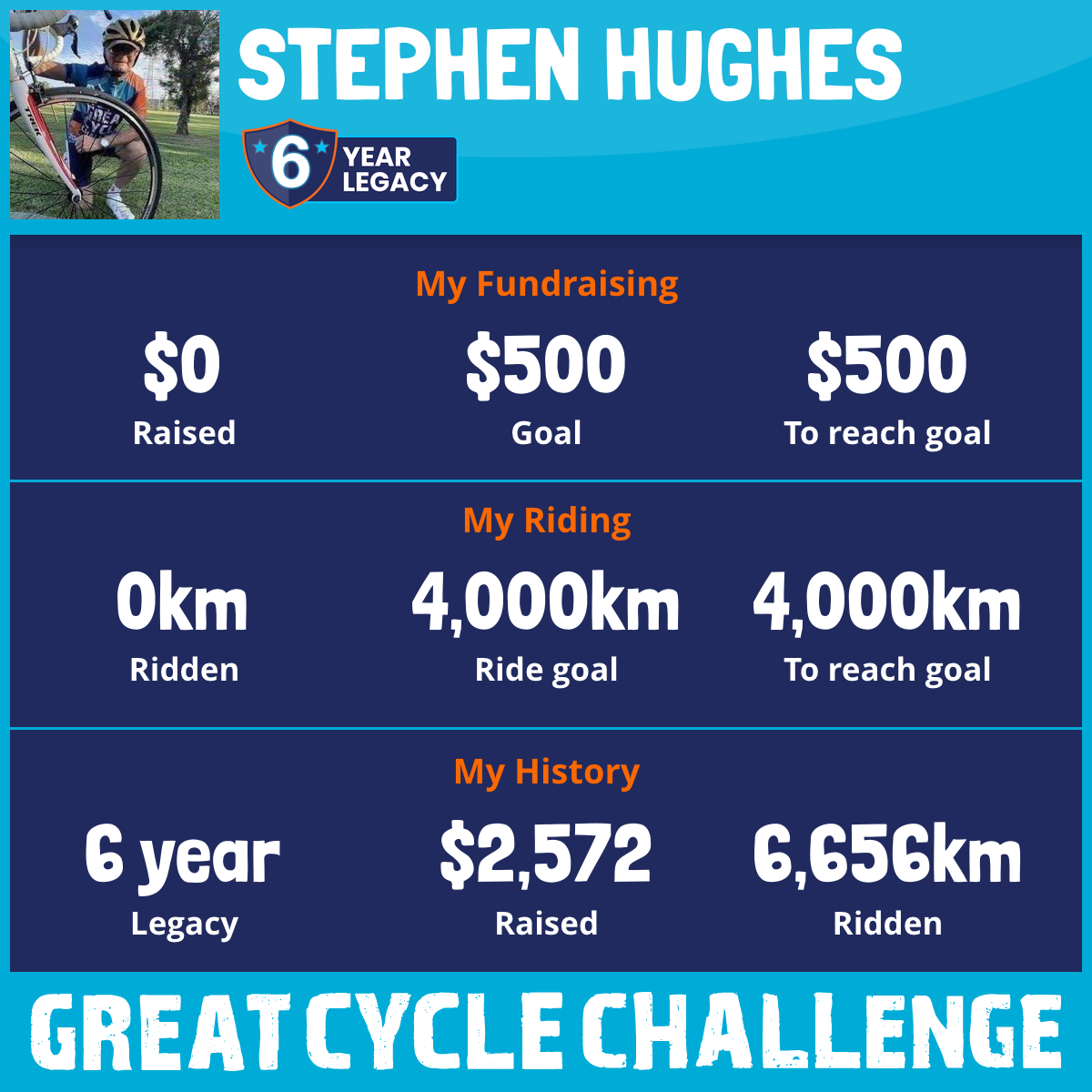 As it comes ever so close once again to ride i dedicate this ride to my friends and my dear Dad who have lost their battle to this disease Cancer by doing this and also riding for our future kids with Cancer we fight the battle to win and give them the chance to also be a survivor and live on as research and medical treatment becomes available to kick Cancers butt from our kids who have not even lived life but will because each one of us that rides makes this possible through the funds raised by the challenge warm Regards Stephen T Hughes