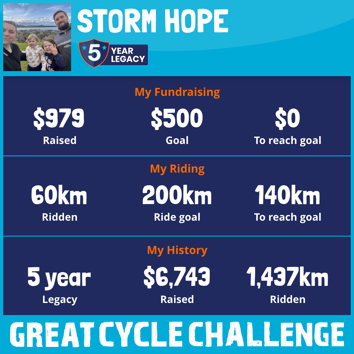 This year, the Hope family is aiming to ride 200km and raise $500 to support kids fighting cancer. Since we first joined in 2021, we’ve raised over $5,700, and we’re hoping to hit the $6,000 milestone by the end of this challenge!