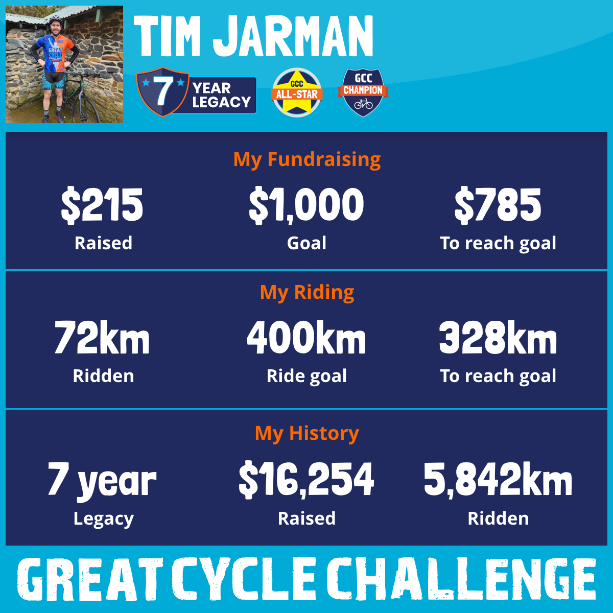 This is my sixth year taking part in the Great Cycle Challenge and once again I am keen to challenge myself to raise funds to fight kids cancer! After my massive month last October completing two half everests, this year I am continuing the theme of long stints on the bike with a 24 hour challenge.